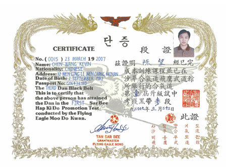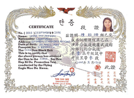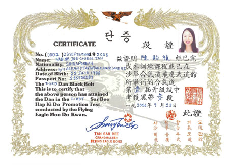 Samples of original Flying Eagle Bong Hapkido certificates issued by Grandmaster Tan Sar Bee Sunny are displayed below.