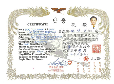 2) To attain a Genuine Flying Eagle Bong Hapkido or Sar Hyun Kong Taekwondo Certificate, Please apply ONLY from Grandmaster Tan Sar Bee Sunny personally or Flying Eagle Bong Hapkido Association of Singapore by Email